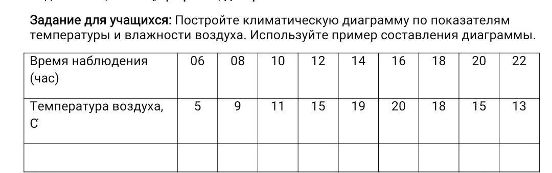 Ну ты здесь просто должна(должен)провести типо эксперимента.В верхнем столбце записывать время,а снизу температура в это время. Я это сделать не могу,так как хз где ты живешь