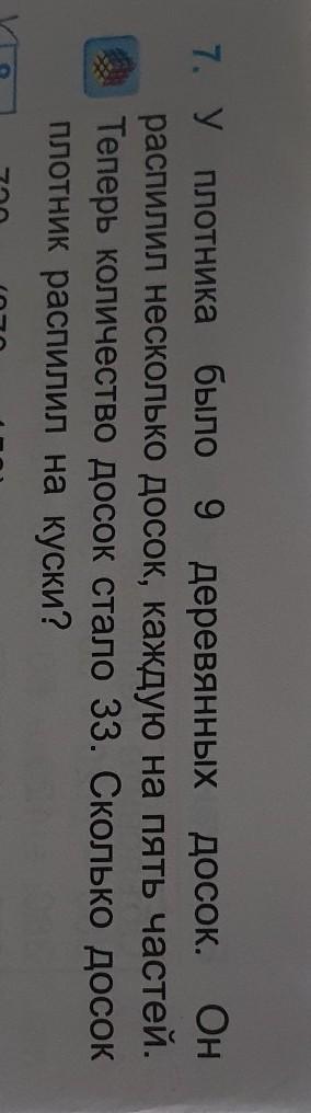 У плотника было 9 деревяных досок. Он распилил несколько досок, каждую на пять чястей. Теперь количиство досок стало 33. Сколько досок плотник распилил на куски?