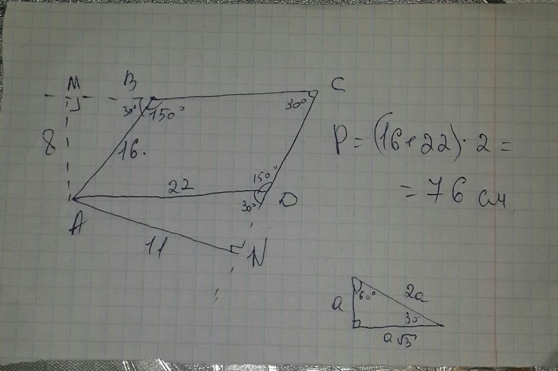 В параллелограмме ABCD проведены высоты AM и AN. Найдите периметр параллелограмма, если AM=8 см, AN=11 см, угол BCD=30 градус.