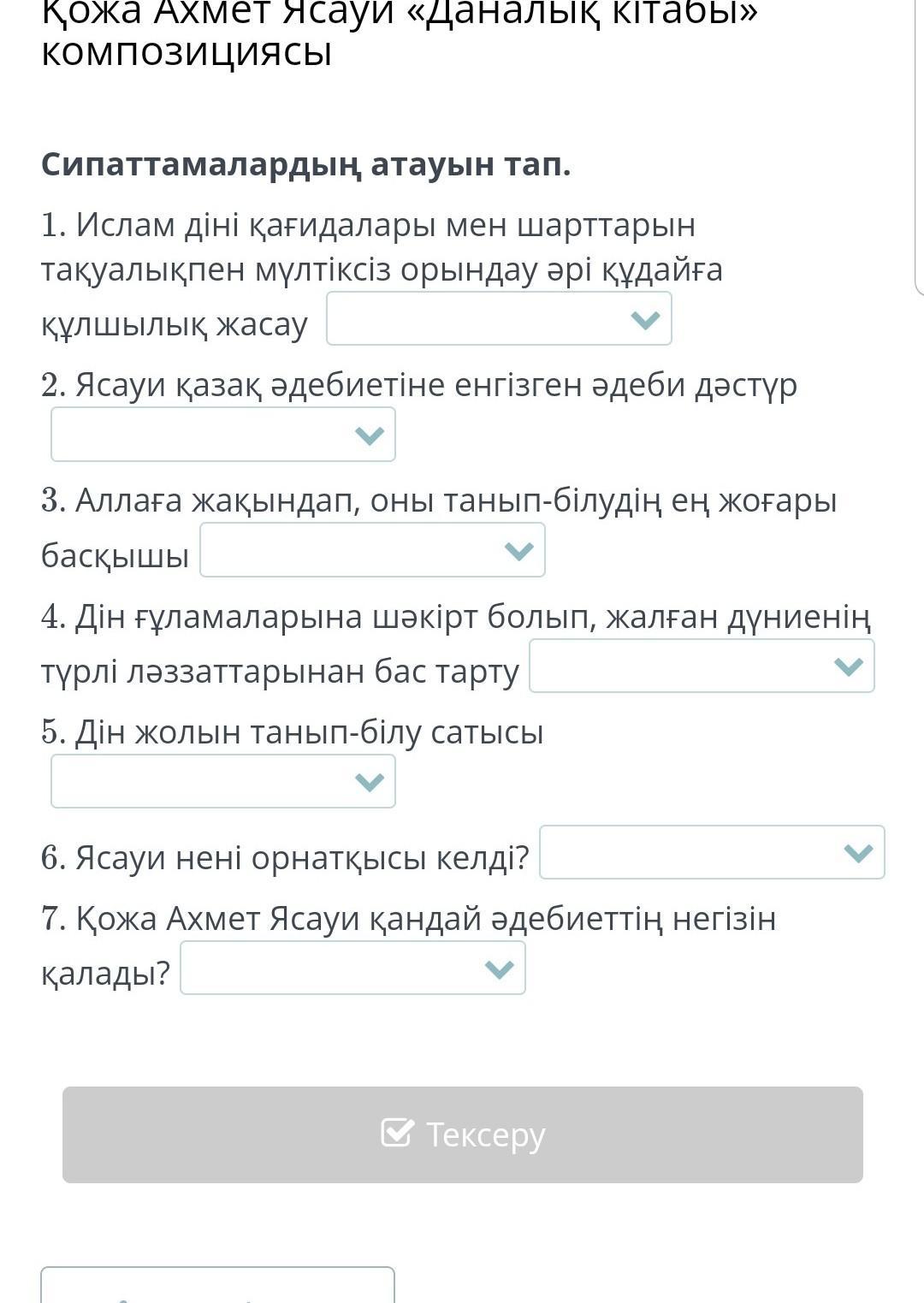 1. Шариғат. 2. Сыншылдық. 3. Хақиқат. 4. Тариқат. 5. Мағрифат. 6. Әділдік. 7. Сопылық.