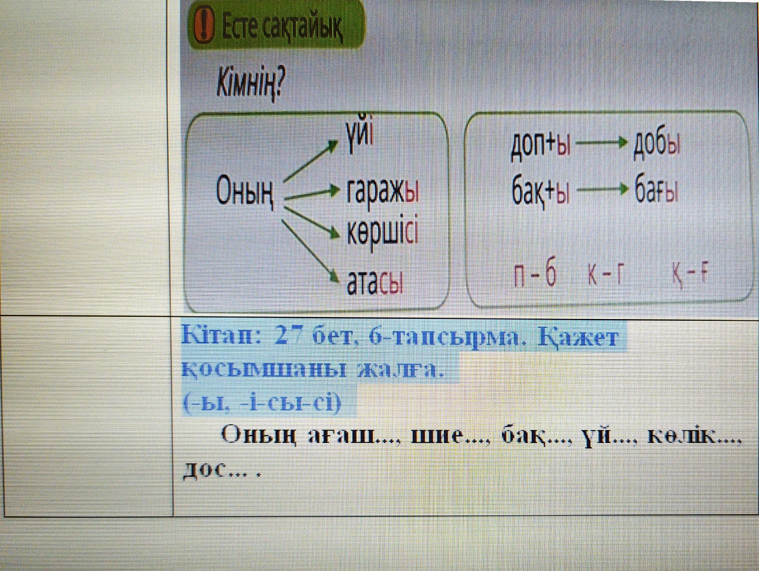 Оның ағашы, шиесі, бағы, үйі, көлігі, досы