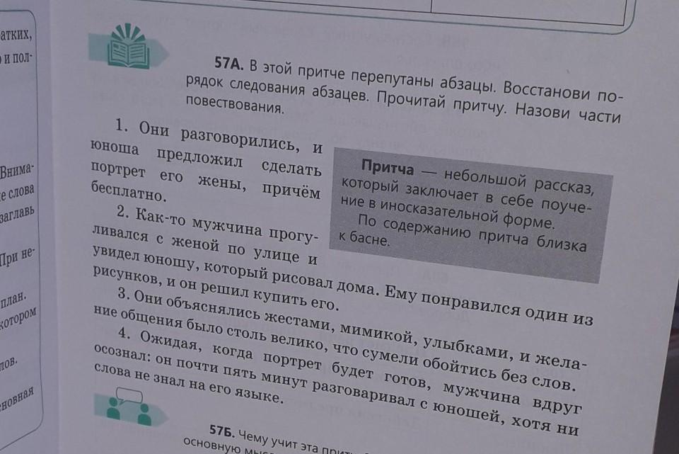 В этой притче перепутаны абзацы.Восстанови порядок следования абзацев.Прочитай притчу.Назови части повествования.Составь план текста!!