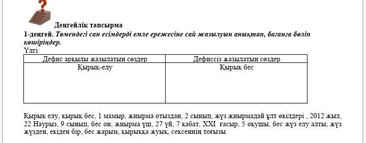 41. Сыңарлары өзара мағыналас жəне қарама-қарсы, жиынтық жəне жалпылама мəндегі, сондай-ақ мағынасы көмескіленген қос сөздер дефис арқылы жазылады: syı-qurmet, úgit-nasıhat, oı-óris, ydys-aıaq, telegeı-teńiz, saltdástúr, er-toqym, el-jurt, jer-jahan, kúsh-qaırat, ońtústik-shyǵys, júrek-tamyr syrqaty, shtrıh-kod, oqý-jattyǵý, ákimshil-qysymshyl; úlken-kishi, kári-jas, alys-jaqyn, ashshy-tushshy, alys-beris, joǵary-tómen, kóshi-qon, aıtty-aıtpady, kirerkirmesten, kelimdi-ketimdi, kári-qurtań, kóılekkónshek, et-met.