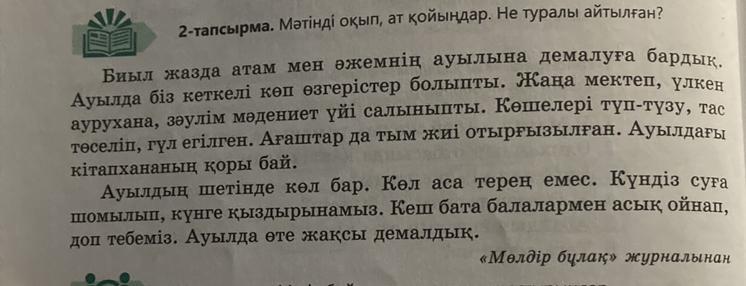 мәтінде баланың жаз демалыстарында ауылға барып демалуы туралы айтылған. Баланың әжесінің ауылындағы өзгерістер болып, дамуы туралы айтылады.