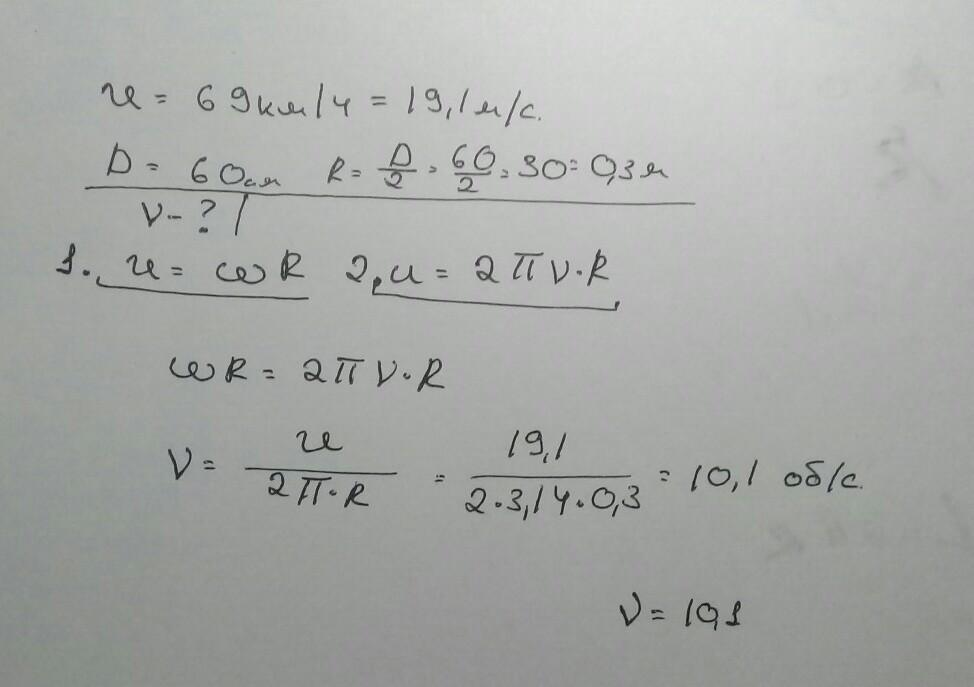 Автомобиль движется со скоростью 69км/ч. Сколько оборотов в секунду делают его колеса, если они катятся по шоссе без скольжения, а внешний диаметр покрышек колес равен 60см?