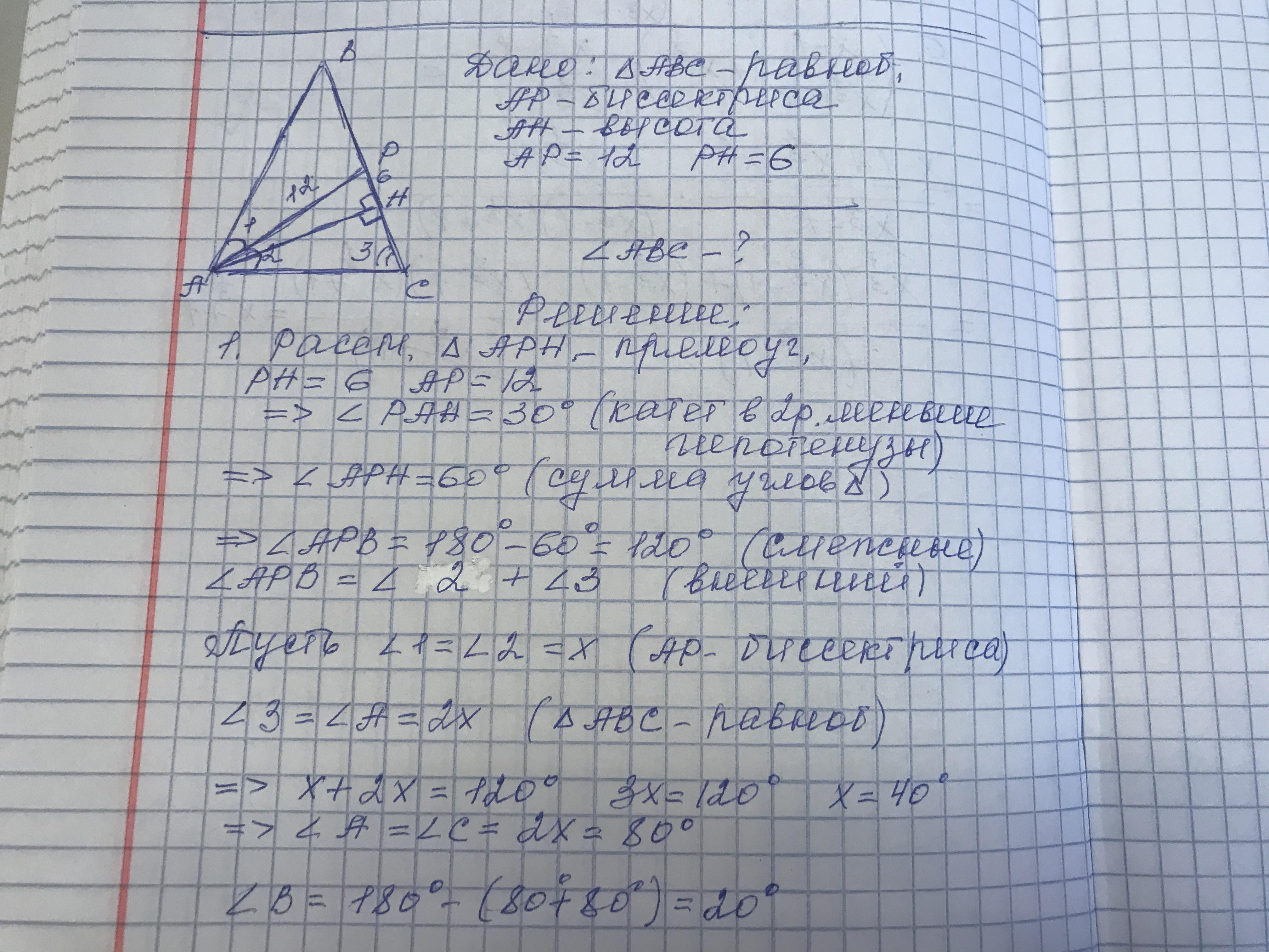 В равнобедренном тупоугольном треугольнике АВС с основанием АС проведены биссектриса АР и высота АН. Найдите угол АВС, если АР=12, РН = 6. Запишите подробное решение и ответ.