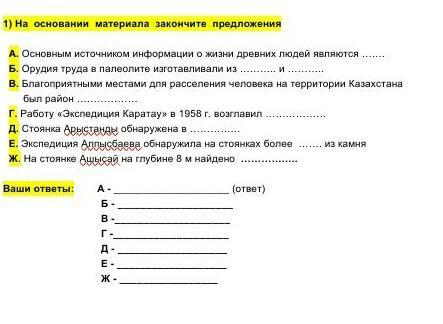 1.исследования археологов, 2. из различных видов камня, 3. район хребта Каратау в Южном Казахстане, 4.Х.А Аплысбаев, 5.Вблизи Большого и Малого хребтов Каратау, 6.Более 5 тысяч орудий труда, 7.Найдено 15 кострищ