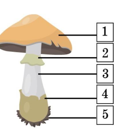 Используя рисунок, запиши номера обозначений, соответствующие названиям частей шляпочного гриба.