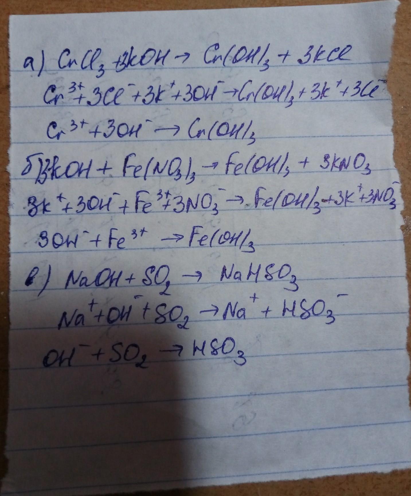 Составить молекулярные,полные и сокращенные ионные уравнения.Для 1 варианта:а) между хлоридом хрома(3) и гидроксидом калия б) гидроксидом калия и нитратом железа(3) в) гидроксидом натрия и оксидом серы(4).И обратно:из данных сокращенных составить молекулярные и полные ионные :Fe3+3(OH)=Fe(OH)3