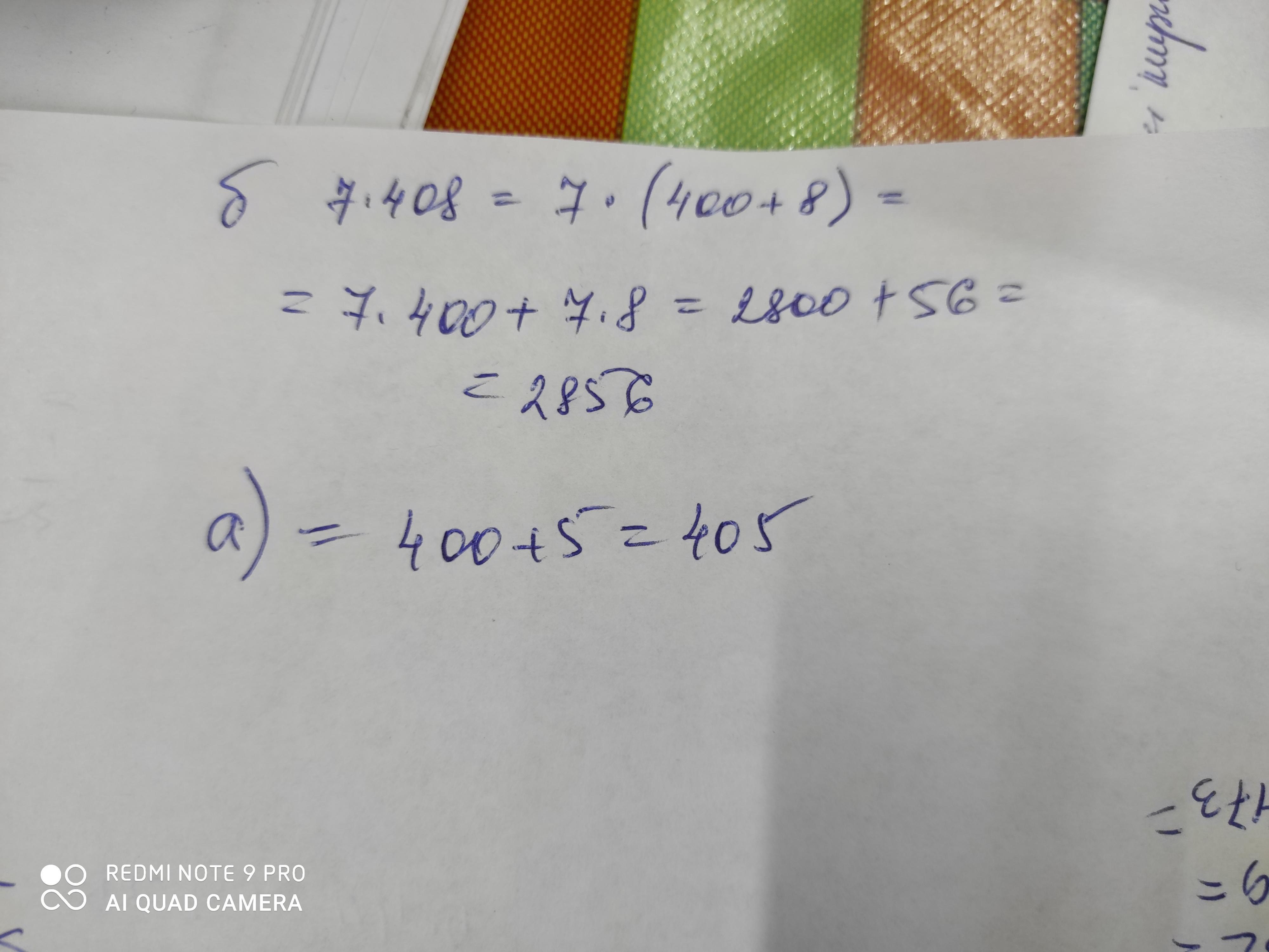 Вычислите значения произведений, использую распределительный закон. А) 5*81=5*(80+1)=5*80+5*1. б) 7*408