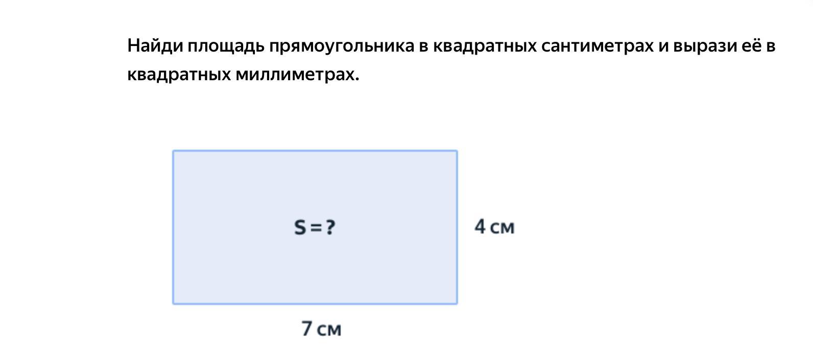 Найди площадь прямоугольника в квадратных сантиметрах и вырази её в квадратных миллиметрах.