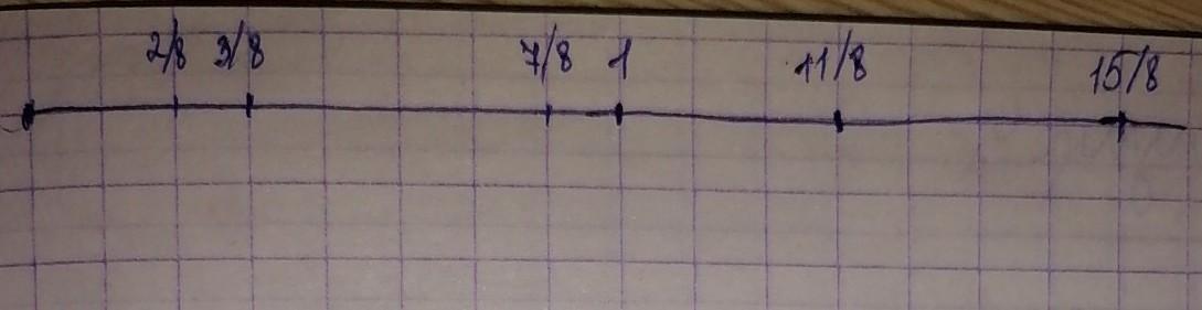 Начертить координатный луч, приняв за единичный отрезок длиной 8 клеток тетради. Отметить на этом луче точки с координатами: 1 5/8; 1 1/8; 3/8; 7/8; 2/8; 1 5/8.