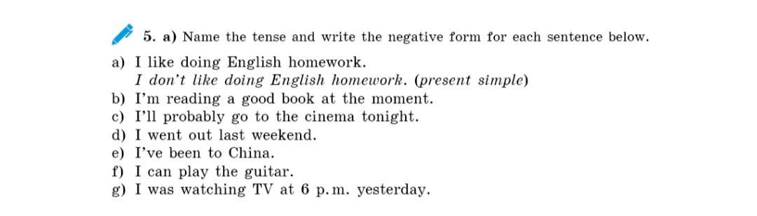 Помогите. Здесь предложения нужно сделать в отрицательной форме+написать какое время(present simple,past simple,future continuous) и т.д. и другие времена.