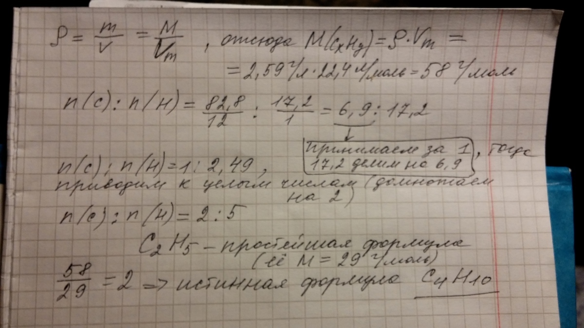 Определить молекулярную формулу углеводорода, если массовая доля углерода в нем равна 82,8%, а плотность этого вещества составляет 2, 59 г/л
