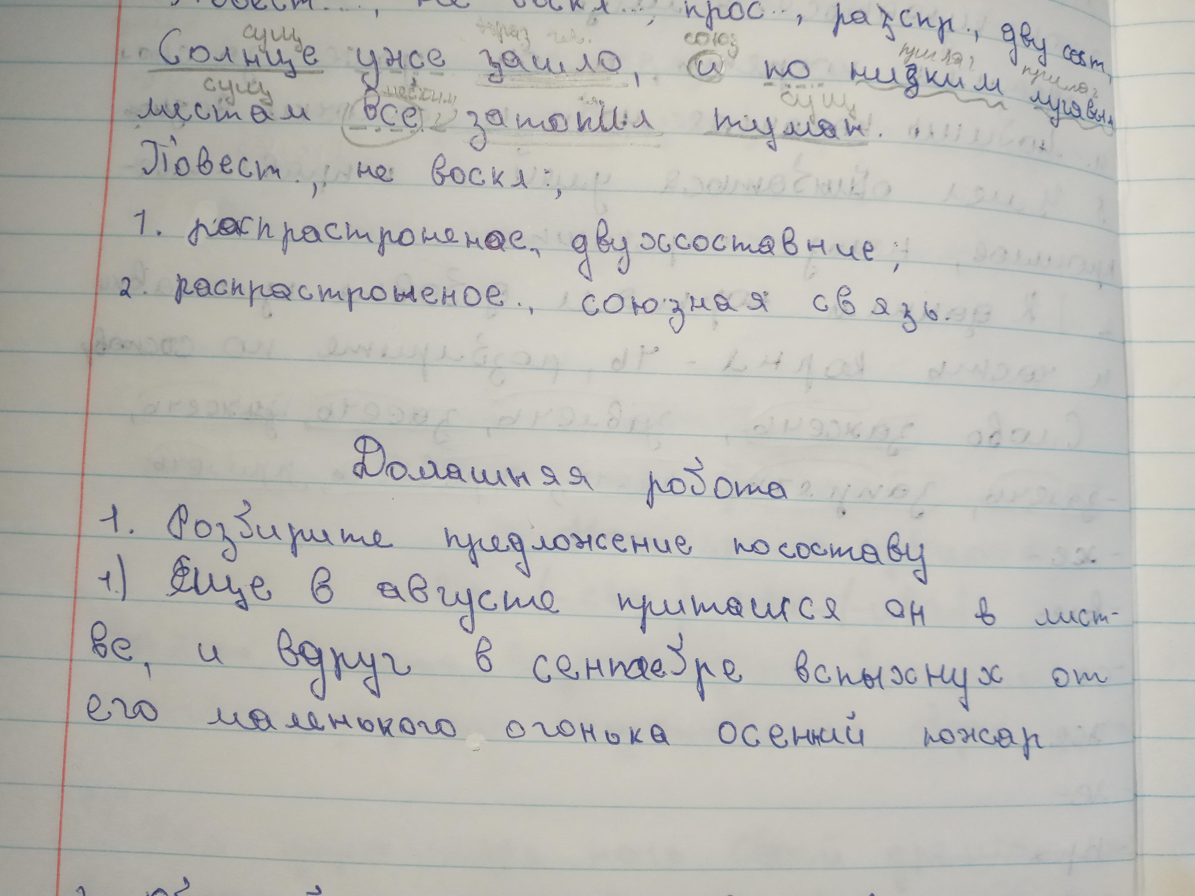 Ещё(нар,._._.) в(пред) августе(сущ,_ _ _) притаился(глаг,сказуем) он(мест, подл) в(пред) листве(сущ, _ _ _) и(союз) вдруг(нар, _ ._.) в(пред) сентябре(сущ, _ _ _) вспыхнул(глаг, сказуем) от(пред) его(мест, _ _ _) маленького(прил, опред) огонька(сущ, _ _ _) осннний(прил, опред) пожар(сущ, _ _ _)