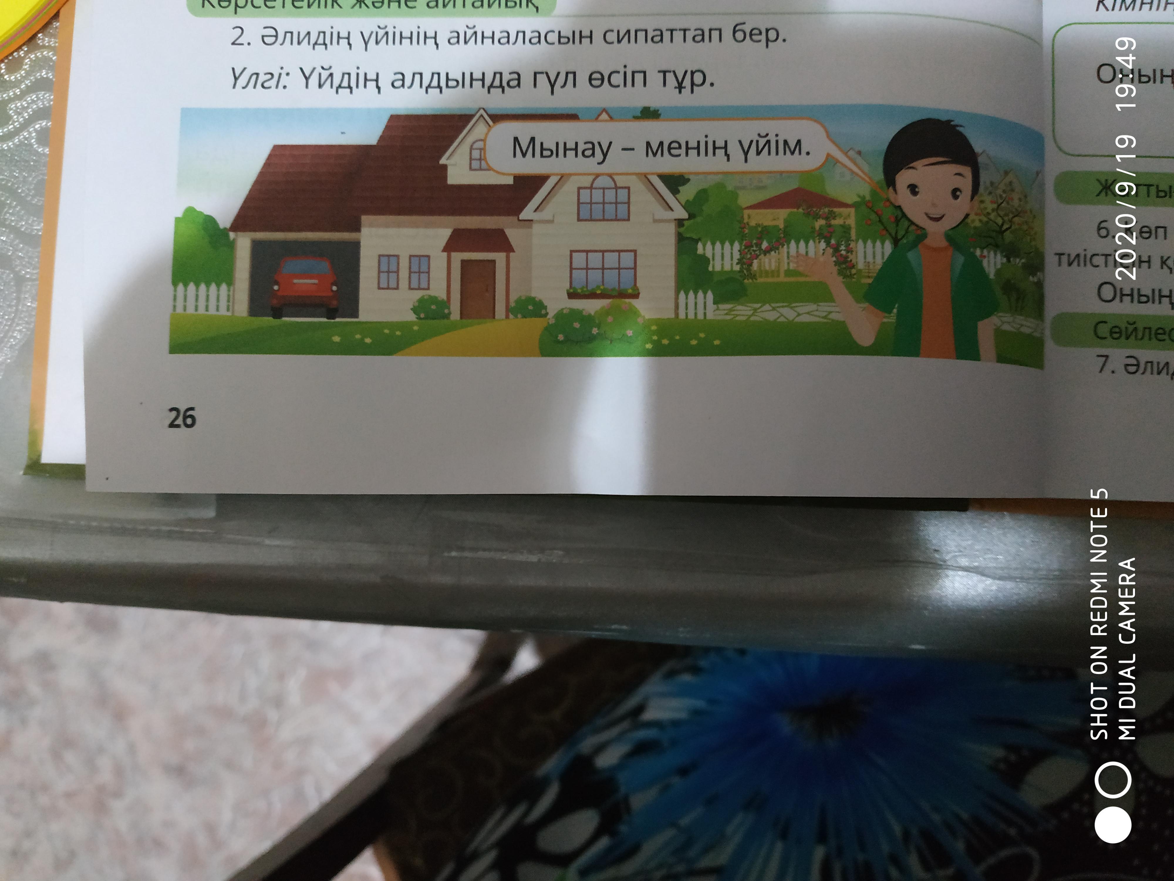 менің үйім үлкен. Үйдің ауласында әдемі гүлдер өсіп тұр. Үйдің бес терезесі бар. Үйдің қасында көлік қоятын жер бар. Үйдің төбесі қызыл таспен жасалған. Үйдің төрт бөлмесі бар.