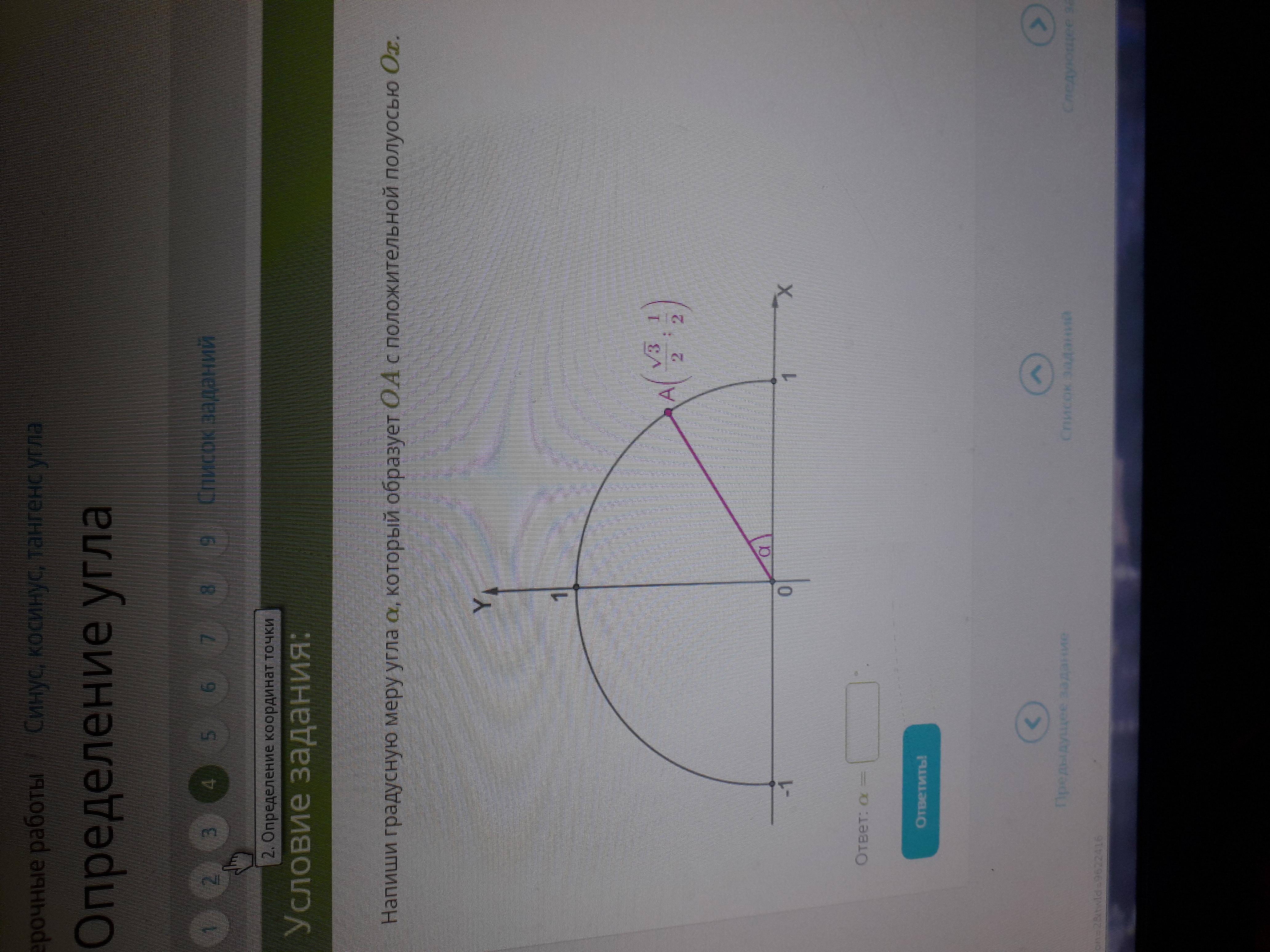 Знаем, что tga=y/x, т.е. tga=(1/2)/(√3/2)= 1/√3=√3/3.
