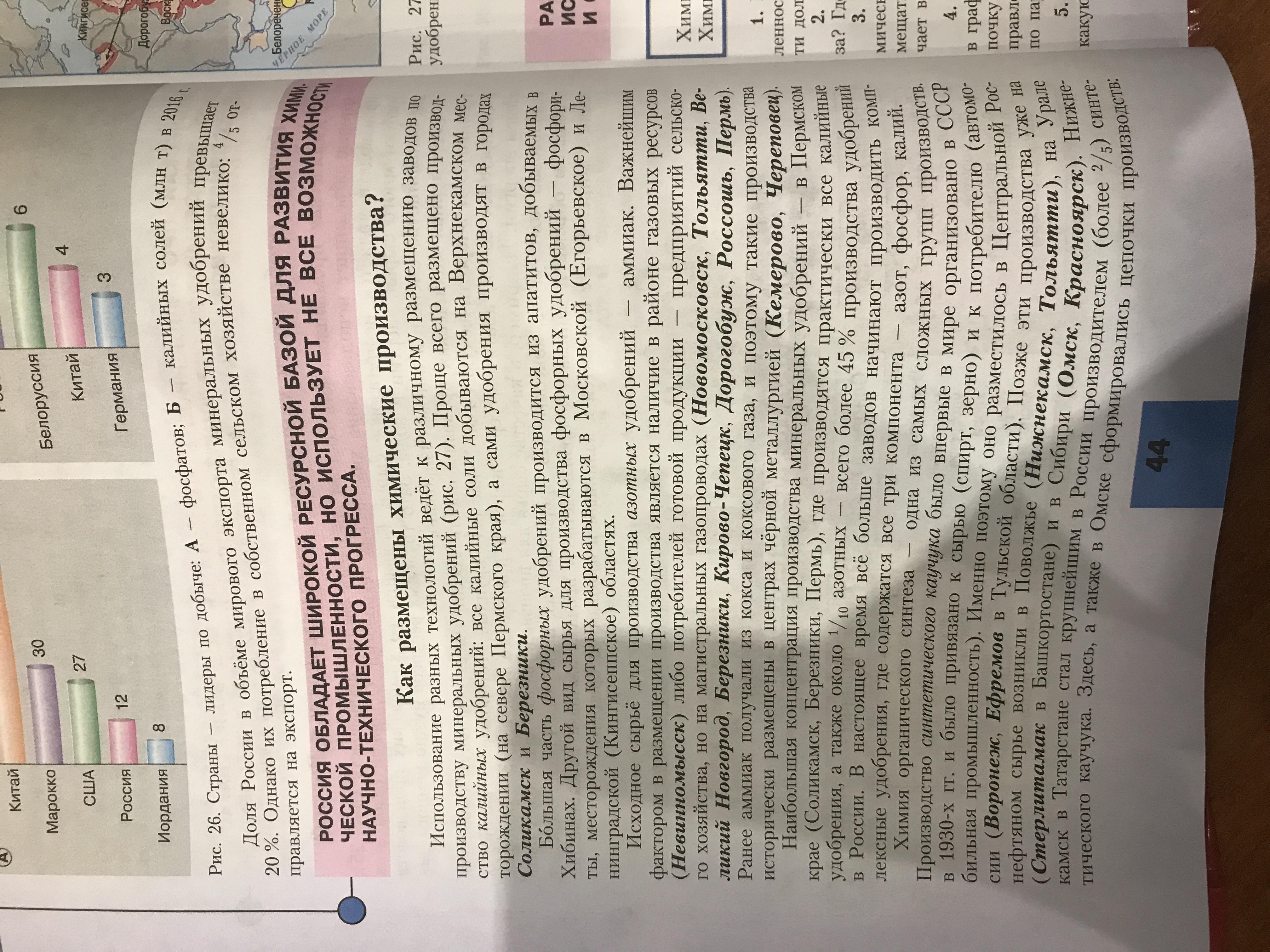 По этой карте можно сказать, что основные центры производства азотных удобрений являются Березники, Пермь, Менделеевск, Салават.Калийных удобрений-Соликамск.Фосфорных-Белореченск, Невинномысск, Кингисепп, Россошь, Новомосковск, Дорогобуж, Великий Новгород, Воскресенск, Череповец.