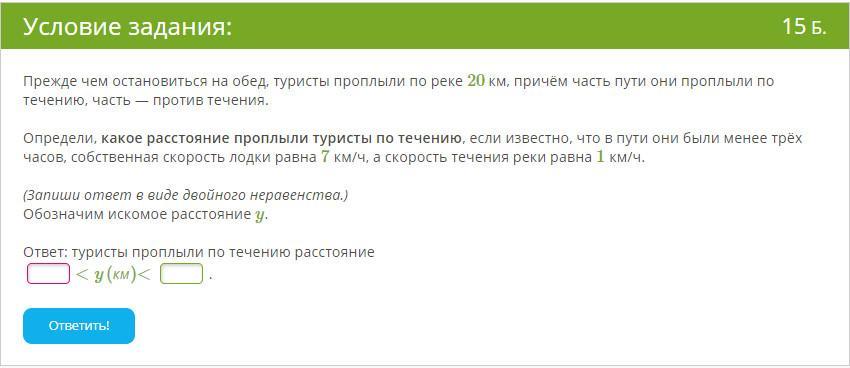 тогда расстояние, которое туристы проплыли по течению y>20-12⇒y>8, но <20