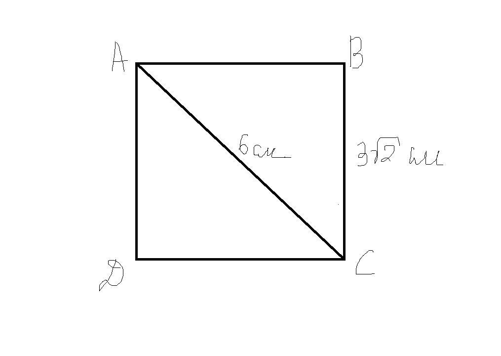 Квадрат - это правильный четырёхугольник, т.е. это четырёхугольник, у которого все углы равны и все стороны равны. У нас дан квадрат АBCD. У квадрата дианонали равны ⇒ d = AC = BD = 6 см. У квадрата все стороны равны ⇒ а = AB = BC = CD = AD. Диагональ d квадрата со стороной а можно рассматривать как гипотенузу прямоугольного равнобедренного треугольника с катетом a: d²=2a². Таким образом, сторона а равна: 6²=2а²; 36=2а²; а²=36/2; а²=18; а=√18; а=3√2 см ⇒ АD = 3√2 cм. Теперь, зная сторону квадрата найдём его площадь: S=a²=(3√2)²=3√2*3√2=√18*√18=18 cм.