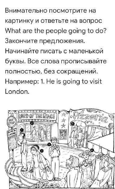 1. a man is going to go to London by bus. 2. Ничего не вижу, сорян. 3. a woman is going to sit on a bench 4. a man is going to take a picture of a woman. 5. people are going to eat pizza. 6. the girl is going to buy a dress.