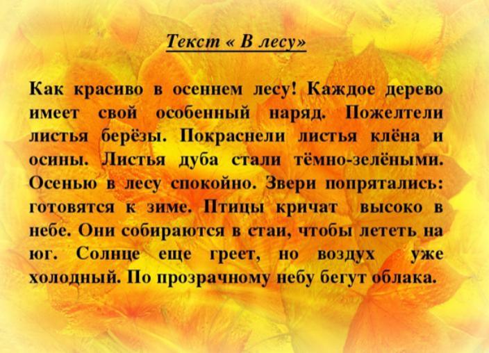 Текст "В Лесу" Как красиво в осеннем лесу! Каждое дерево имеет свой особенный наряд. Пожелтели листья берёзы. Покраснели листья клёна и осины. Листья дуба стали тёмно-зелёными. Осенью в лесу спокойно. Звери попрятались:готовятся к зиме. Птицы кричат высоко в небе. Они собираются в стаи, чтобы лететь на юг. Солнце еще греет, но воздух уже холодный. По прозрачному небу бегут облака.