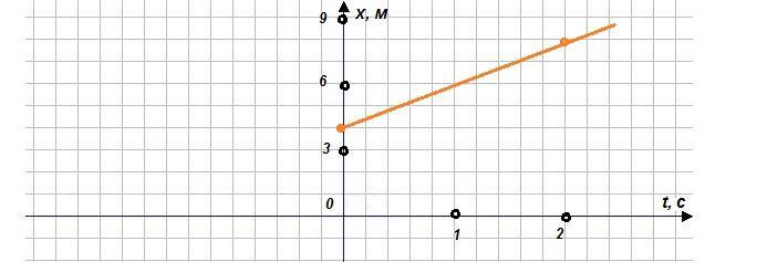 Движение пешехода описывается зависимостью координаты тела от времени x(t)=4+2t. Построить график движения. Найти начальную координату, величину проекции скорости на ось х , координату х через 30с.