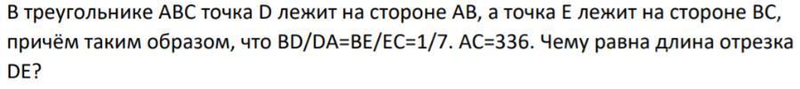 Следовательно, треугольник DBE подобен треугольнику ABC. Значит, DE/AC = BD/DA = BE/EC = 1/7