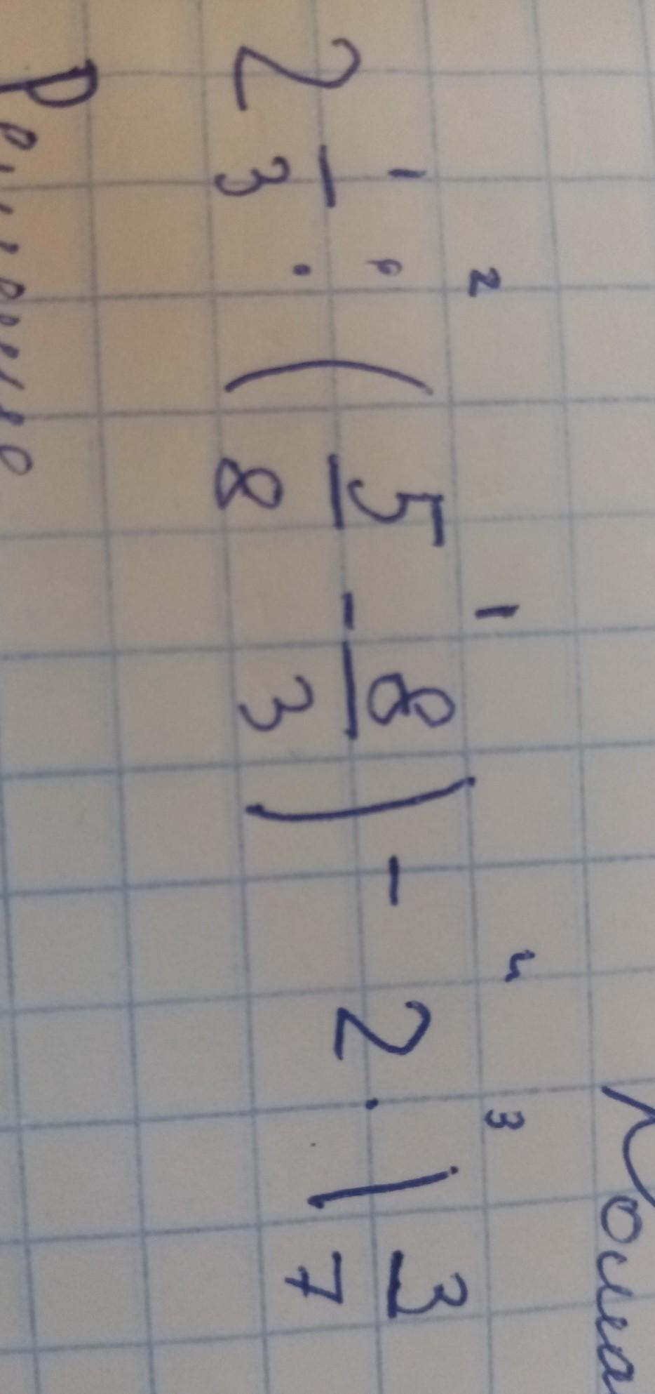 2 1/3 ÷ (5/8-8/3)-2× 1 3/7= 7/3÷(15/24-64/24) - 2 × 10/7 =7/3 ÷ (-49/24)-20/7= 7/3 × (-24/49) -20/7= -8/7-20/7=-28/7. Ответ: -28/7