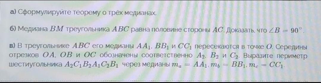 а) Три медианы треугольника пересекаются в одной точке, и каждая из них делится точкой пересечения в отношении 2:1, если считать от вершины.