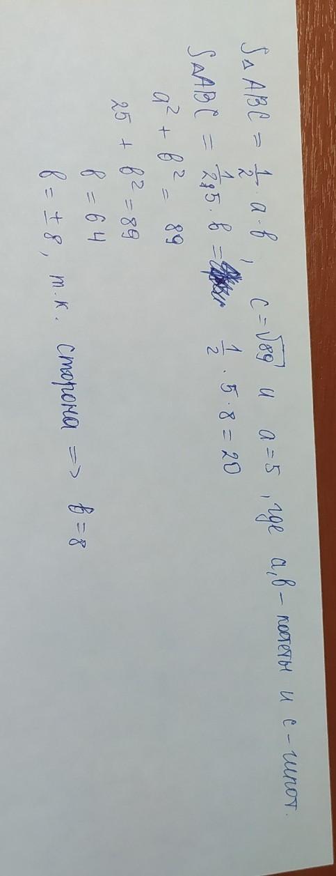 Найди площадь прямоугольного треугольника, если его гипотенуза равна √89, а один из катетов равен 5.