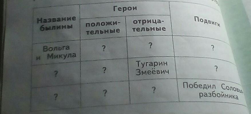 В этой таблице нужно написать былину положительных и отрецательных персонажей а так же подвиги в этих былинах