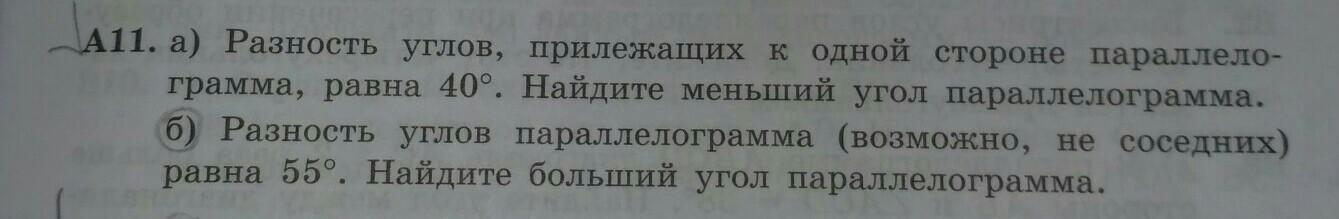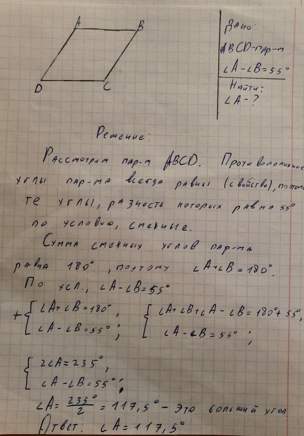 разность углов параллелограмма равна 55°. Найдите больший угол параллелограмма