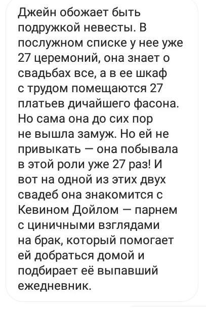 Джейн келіншек болғанды жақсы көреді. Оның жазбаларында қазірдің өзінде 27 рәсім бар, ол үйлену тойы туралы бәрін біледі, ал ең жабайы стильдегі 27 көйлек оның шкафына сыймайды. Бірақ оның өзі әлі үйленген жоқ. Бірақ ол бейтаныс емес - ол осы рөлде 27 рет болған! Осы екі үйлену тойының бірінде ол Кевин Дойлмен кездеседі, ол үйленуге деген циникалық көзқараста, ол үйге жетуге көмектеседі және тастап кеткен күнделігін алады.