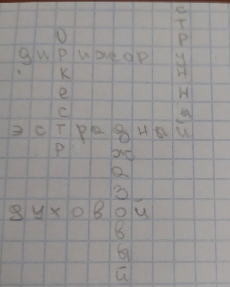 составить кроссворд со следующих слов: дирижёр,духовой,струнный,джазовый,эстрадный,где ключевое слово-оркестр.