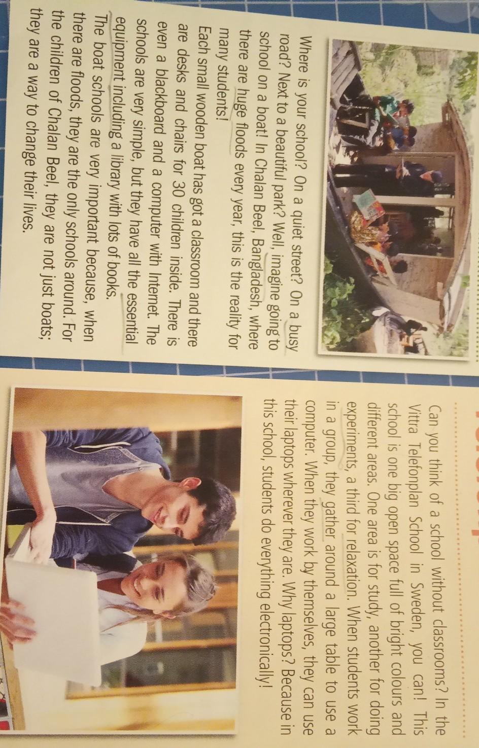 1 текст - Где находится наша школа? На тихой улице? Не оживлённой дороге? Рядом с красивым парком? Ну, представьте себе, что вы едете в школу на лодке! В Чалан-бил, Бангладеш, где каждый год происходят огромные наводнения, это реальность для многих студентов! В каждой маленькой деревянной лодке есть классная комната, а также столы и стулья для 30 детей внутри. Есть даже классная доска и компьютеры с Internet. Школы очень просты, но у них есть всё необходимое оборудование, включая библиотеку с большим количеством книг. Лодочные школы очень важны, потому-что, когда случаются наводнения, они единственные школы вокруг. Для детей Чалан-била это не просто лодки, это способ изменить свою жизнь.