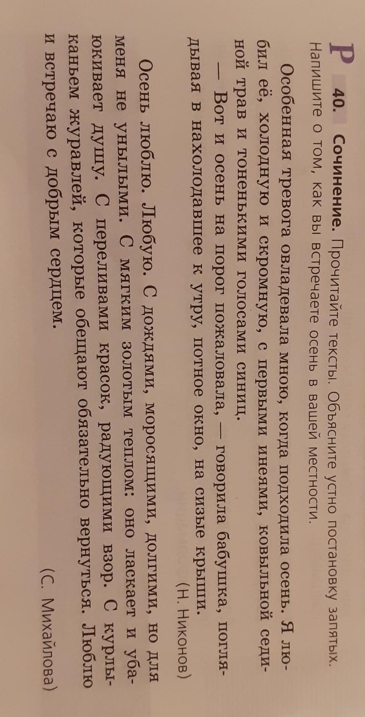 прочитайте тексты. Объясните устно постановку запятых. Напишите о том, как вы встречаете осень в вашей местности.