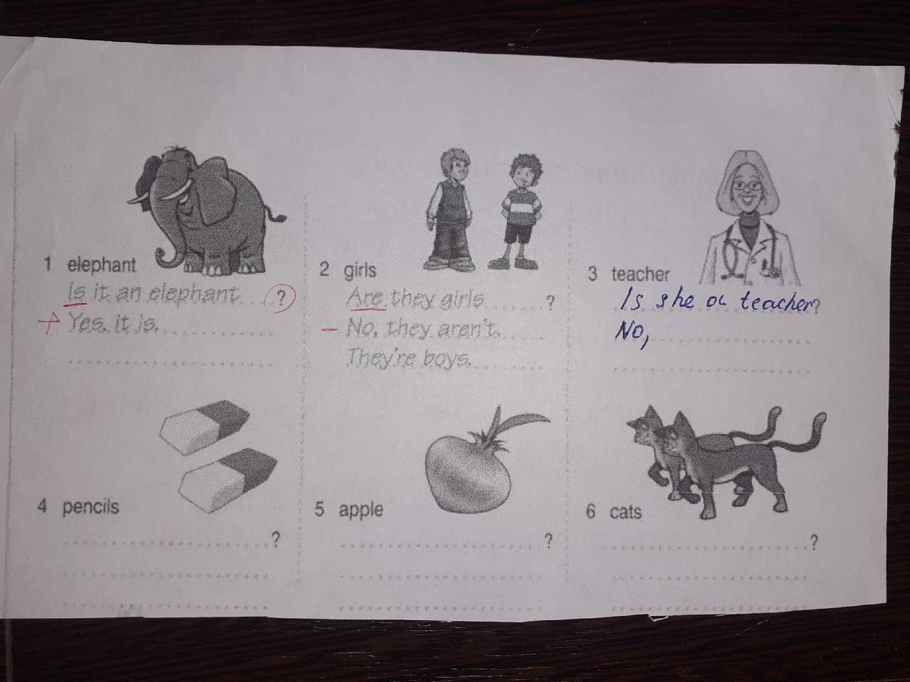 3. is she a teacher? No, she isn't. She is a doctor. 4. Are they pencils? no they aren't. They are erasers. 5. is it an apple? no it isn't. it is an onion. 6. Are they cats? yes they are.