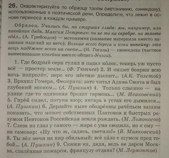 Охарактеризуйте по образцу тропы (метонимию, синекдоху) использованные в поэтической речи. Определите что лежит в основе переноса в каждом примере.