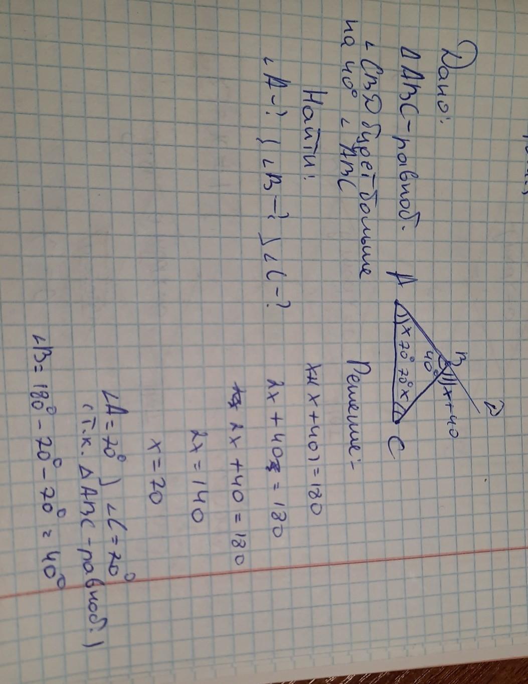 Внешний угол при основании равнобедренного треугольника на 40 градусов больше угла при вершине треугольника.Найдите углы треугольника.