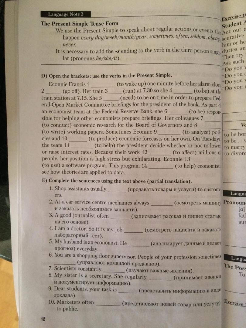 Complete the sentences using the text above (partial translation). 1 shop assistants usually sell products and services to customers. 2 At a car service centre, mechanics always inspect the car and order the necessary spare parts. 3 A good journalist often writes a story and writes an article based on it. 4 I am a doctor. So it's my job to examine the patient and order a lab test. 5 My husband is an economist. He analyzes the data and makes a forecast every day. 6 You are a shopping floor supervisor. People of your profession sometimes manage a sales team. 7 Scientists constantly studying important phenomena. 8 My sister is a Secretary. She regularly receives calls and documents information. 9 Dear students, your task is to provide information in the form of a report. 10 marketers often introduce a new product or service to society .