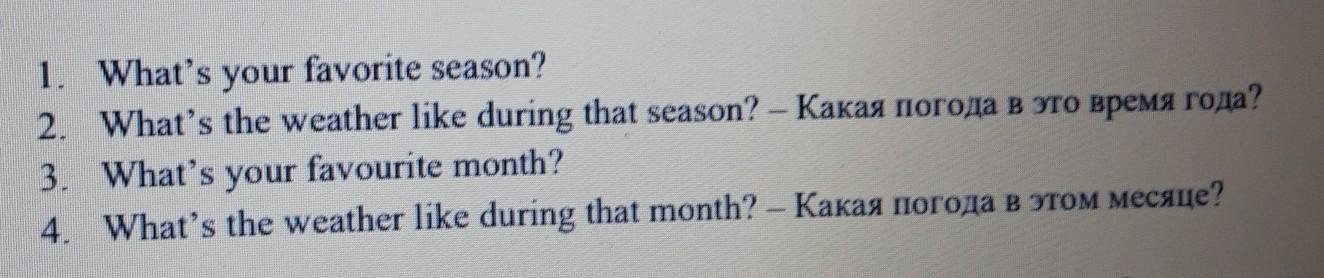 1.My favourite season is summer(лето)/winter(зима)/autumn(осень)/spring (весна).