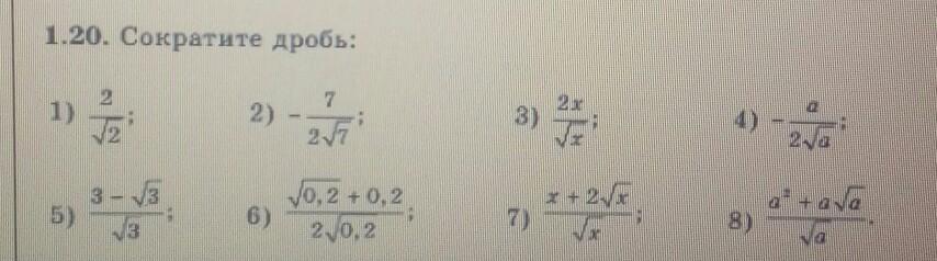 1) \frac{2}{  \sqrt{2} }  =  \frac{ \sqrt{2}  \times  \sqrt{2} }{ \sqrt{2} }  =  \sqrt{2}  \\ 2) \frac{ - 7}{2 \sqrt{7} }  =  \frac{ -  \sqrt{7} \times  \sqrt{7}  }{2 \sqrt{7} }  =  -  \frac{ \sqrt{7} }{2}  \\ 4) \frac{ - a}{2 \sqrt{a} }  =  \frac{ -  \sqrt{a} \times  \sqrt{a}  }{2 \sqrt{a} }  =  -  \frac{ \sqrt{a} }{2}  \\ 5) \frac{3 -  \sqrt{3} }{ \sqrt{3} }  =  \frac{ \sqrt{3}( \sqrt{3} - 1)  }{ \sqrt{3} }  =  \sqrt{3 }  - 1 \\ 6) \frac{ \sqrt{0.2} + 0.2 }{2 \sqrt{0.2} }  =  \frac{ \sqrt{0.2}(1 +  \sqrt{0.2)}  }{2 \sqrt{0.2} }  =  \frac{1 +  \sqrt{0.2} }{2}