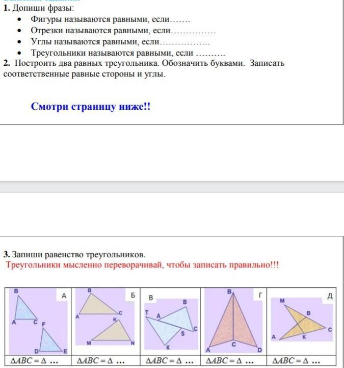 2 представьте, построили два равных прямоугольных треугольника, у которых катеты по 3 см 4 см, а гипотенузы по 5 см. у меня нет возможности попасть в приложение. поэтому не могу Вам кинуть рисунок. Но это не сложно. АВ=ТР= 3 см, ВС= РК=4см, АС=ТК=5 см, и тогда треугольники АВС и ТРК равны.