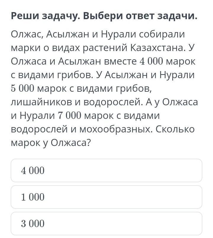Ответ: У Олжаса 3000 марок. Правильный ответ 3-й по счёту.