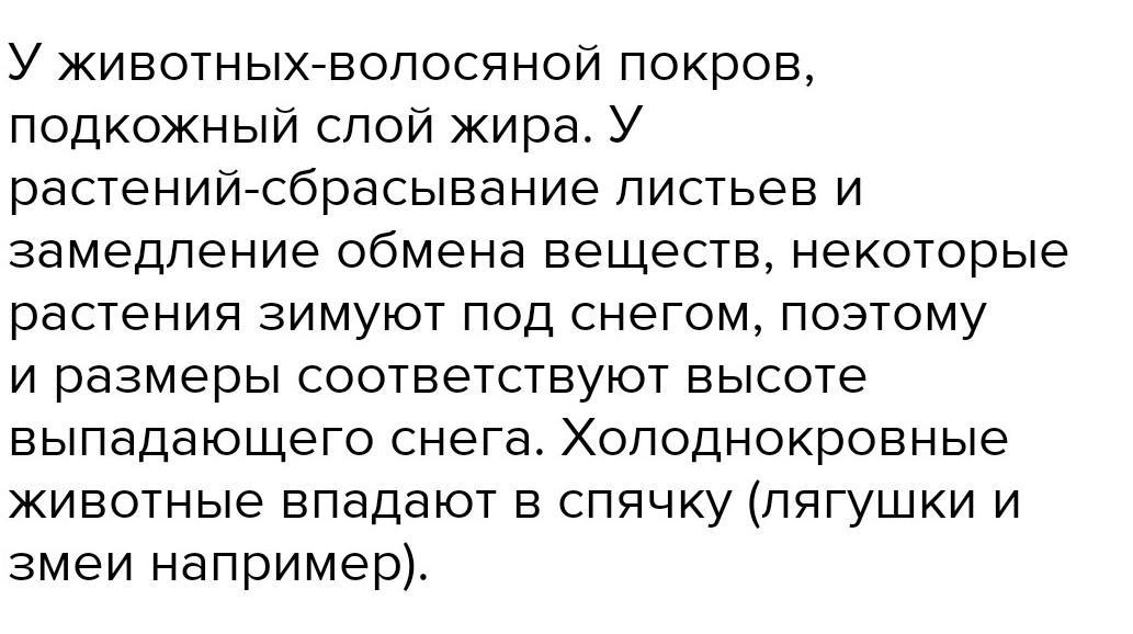 у животных - волосяной покров, подкожный слой жира. у растений- сбрасывание листьев и замедление обмена веществ, некоторые растения зимуют под снегом, поэтому и раазмеры соответствуют высоте выпадающего снега. холоднокровные животные впадают в спячку(лягушки и змеи например)