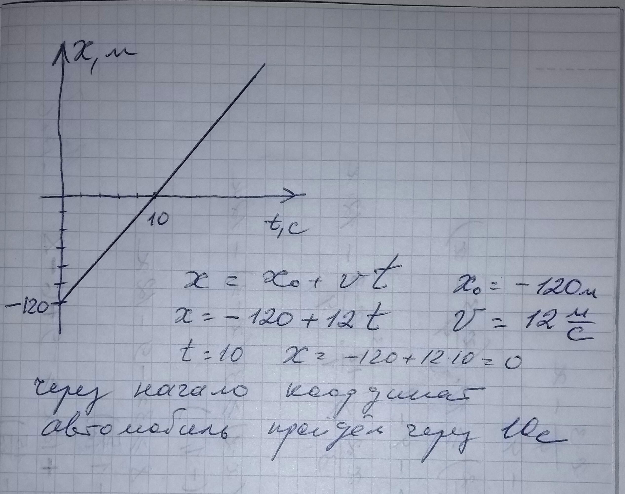 Движение грузового автомобиля описывается уравнением х = -120 + 12t. Опишите характер движения автомобиля, Найдите начальную координату, модуль и направление вектора скорости, координату автомобиля через 20 с. Когда автомобиль пройдет через начало координат? Постройте график зависимости x(t) (график обязательно)