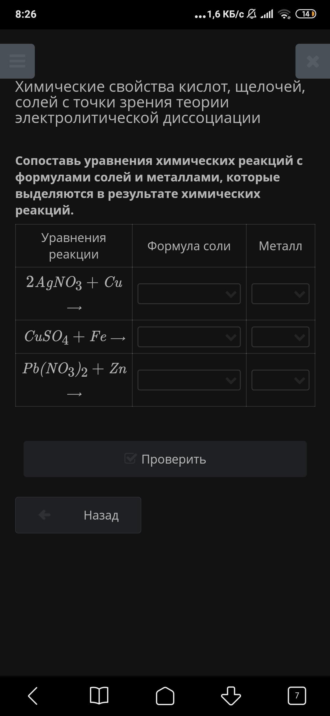 Помогите! Сопоставь уравнения химических реакций с формулами солей и металлами, которые выделяются в результате химических реакций.