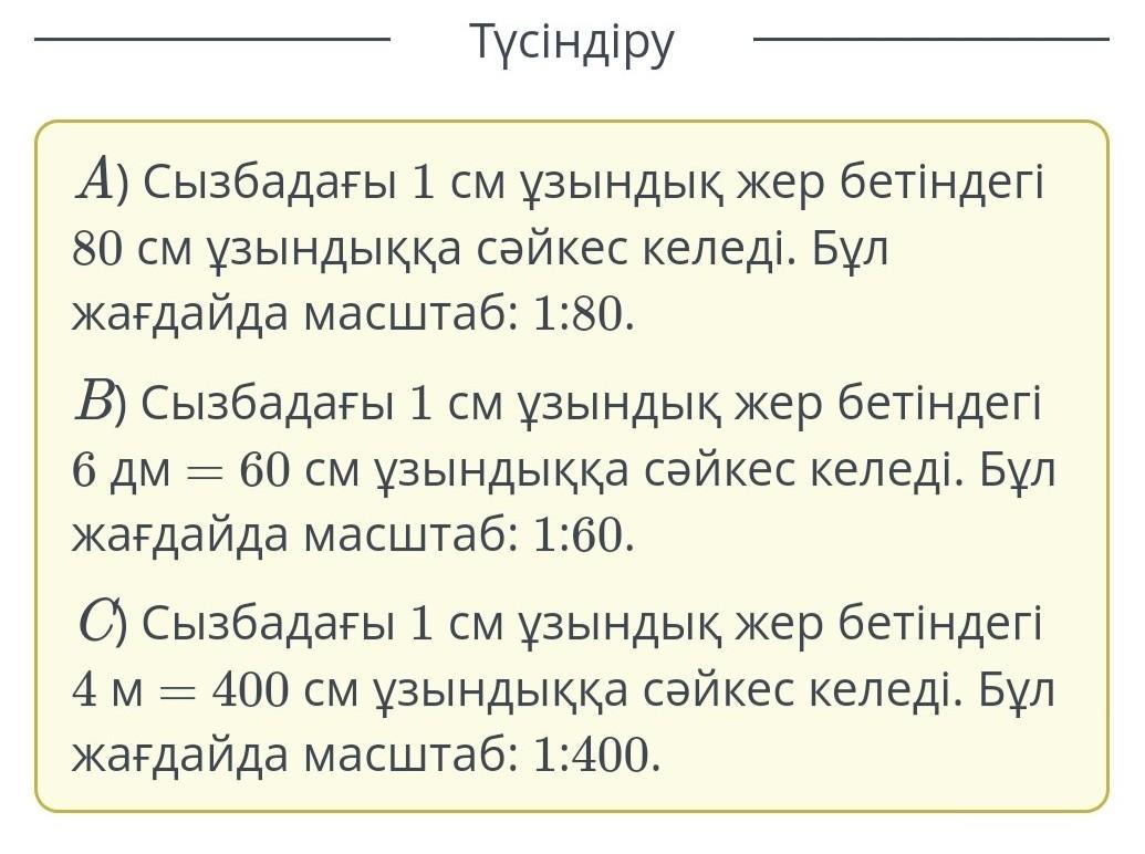 Ұзындығы 60 см (A), 4 дм (B), 3 м (C) болатын кесіндінің сызбадағы ұзындығы 1 см. Сызбаның масштабын тап.
