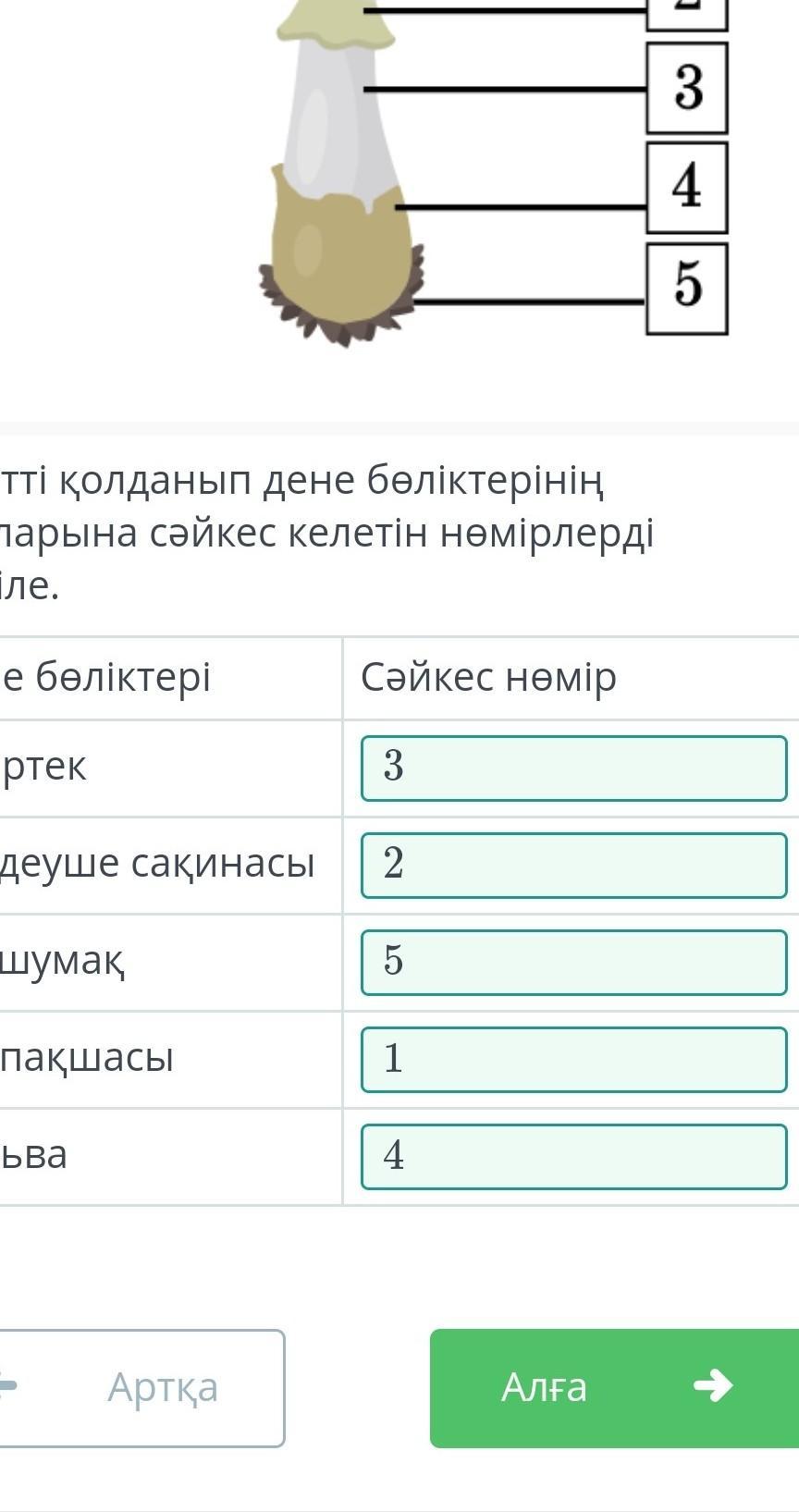 Суретте қалпақшалы саңырауқұлақ берілген. Суретті қолданып дене бөліктерінің атауларына сәйкес келетін нөмірлерді белгіле. Дене бөліктері Сәйкес нөмір Түбіртек Белдеуше сақинасы Жіпшумақ Қалпақшасы 1 Вольва